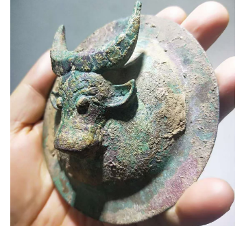 **西周牛头扣首作为青铜礼器的典范,集历史、艺术与宗教价值于一身,堪称商周文明的“活化石”。** 其造型浑厚威严,牛首纹饰兼具写实与神秘色彩,既反映周人“以牲祭天”的礼制传统,又展现青铜铸造技术的巅峰工艺;此类用于祭祀或车马器的青铜构件存世稀少,且多出土于高等级墓葬,具有明确的断代标尺作用。近年来高古青铜器收藏热度攀升,品相完好的带铭文者尤为珍贵,兼具学术研究、艺术审美与资产配置功能,是追溯中华礼乐文明的核心载体。